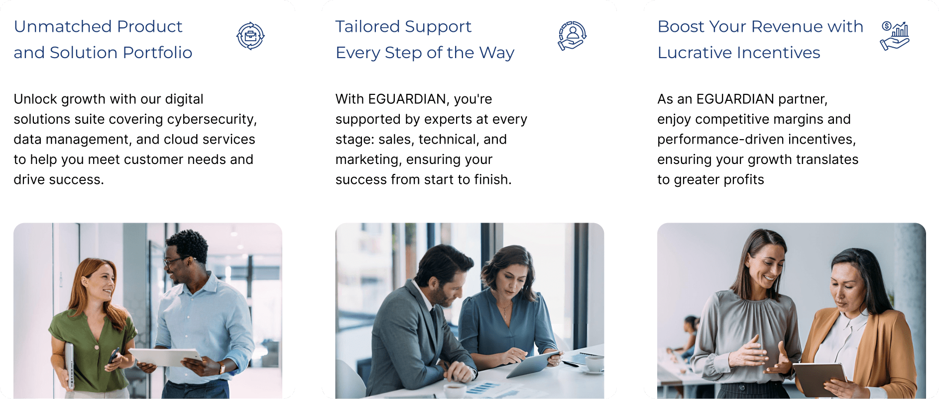 Becoming an EGUARDIAN Solution Partner is completely free, offering high value with exclusive enablement resources, certifications, and dedicated support.